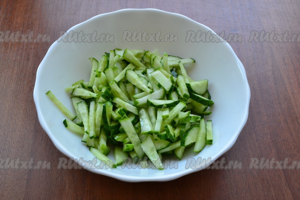 Свежие огурцы нарезать соломкой, немного посолить и оставить на 15 минут.