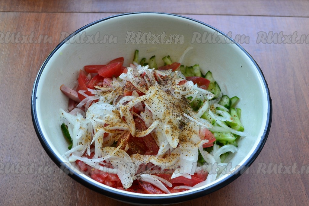 Лук отжать и добавить в салат вместе с перцем и солью.
