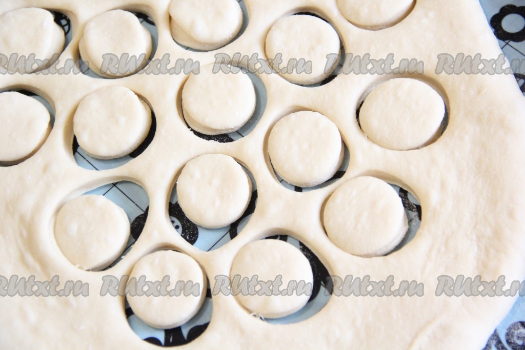 Тесто раскатать скалкой в пласт толщиной 1,5 см. Вырезать из теста круги, размер пончиков выбирайте сами, я сделала маленькие, чуть больше грецкого ореха.