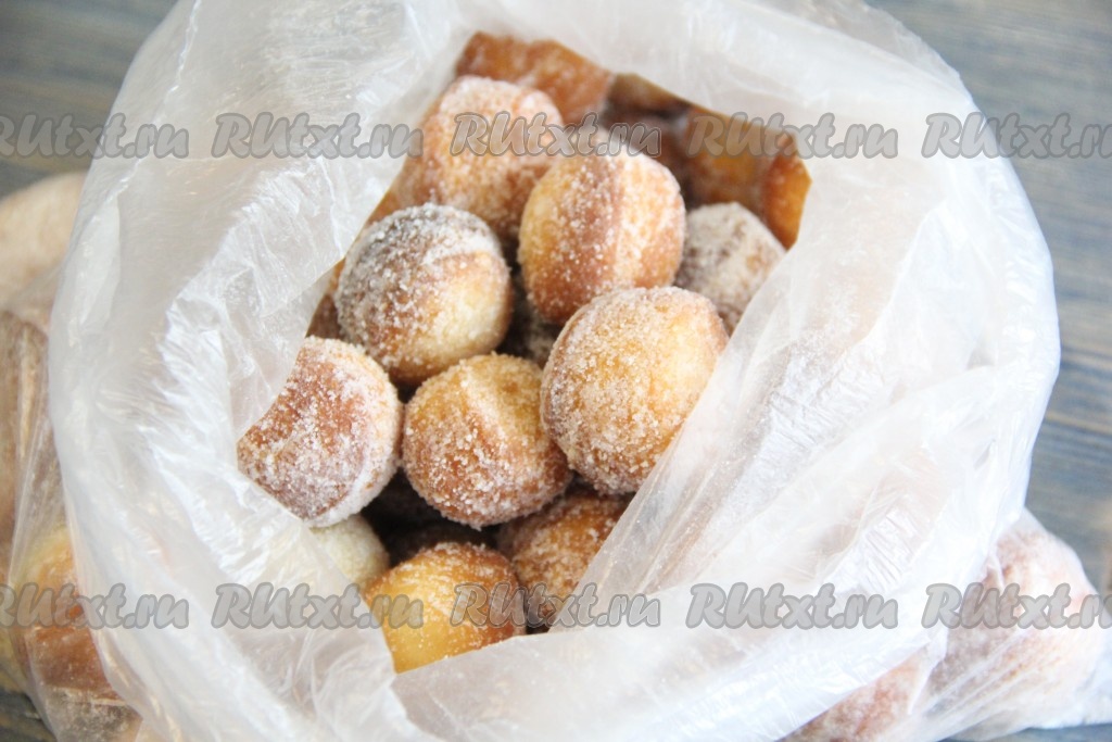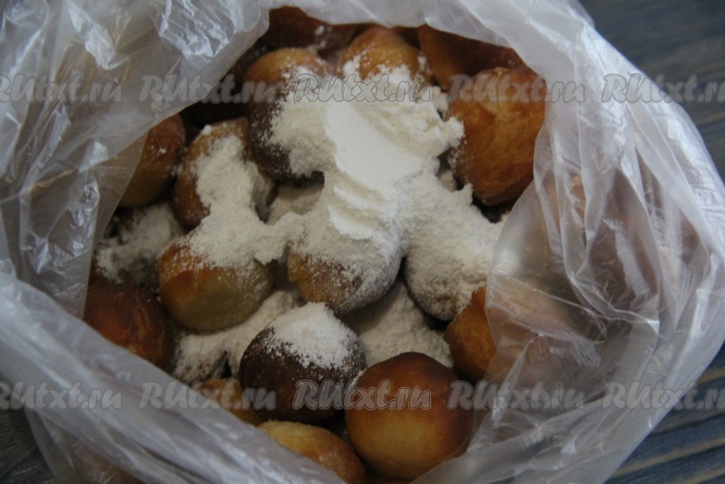 Пончики слегка остудить, переложить в пакет и добавить сахарную пудру.