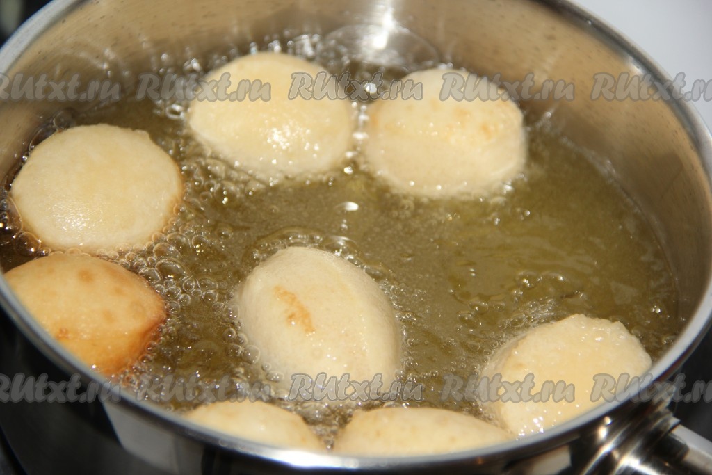 Хорошо разогреть растительное масло для фритюра и аккуратно опустить в него кружочки теста. Жарить пончики на среднем огне до золотистого цвета со всех сторон.