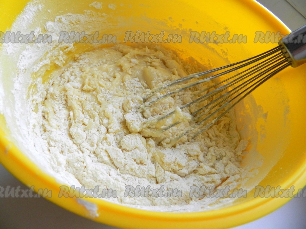 В тесто всыпать разрыхлитель и 200 грамм просеянной муки, перемешать тесто до однородности.