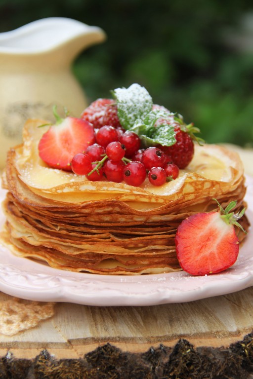 Готовые блинчики посыпать сахарной пудрой или полить сгущёнкой, можно украсить свежими ягодами. Очень нежные и вкусные блины с крахмалом на молоке подать к столу.