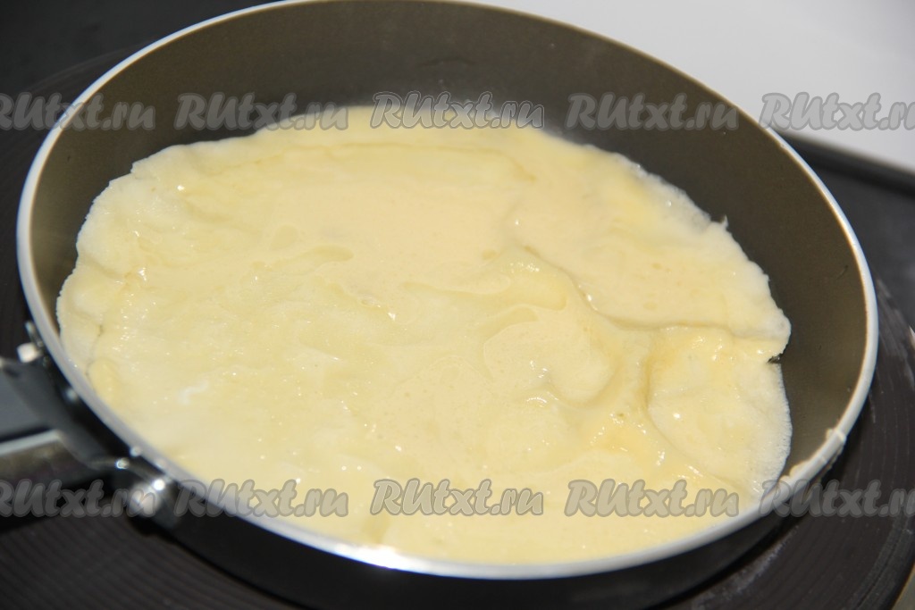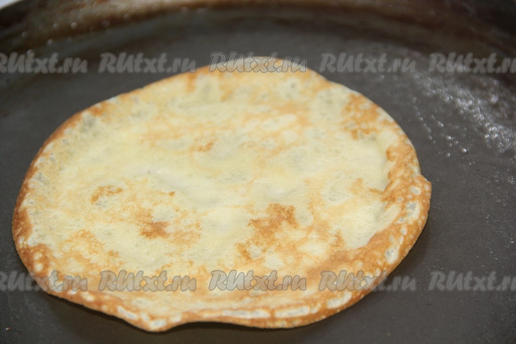 Выпекать блинчики на сковороде. Я смазала сковороду маслом только перед выпеканием первого блина.