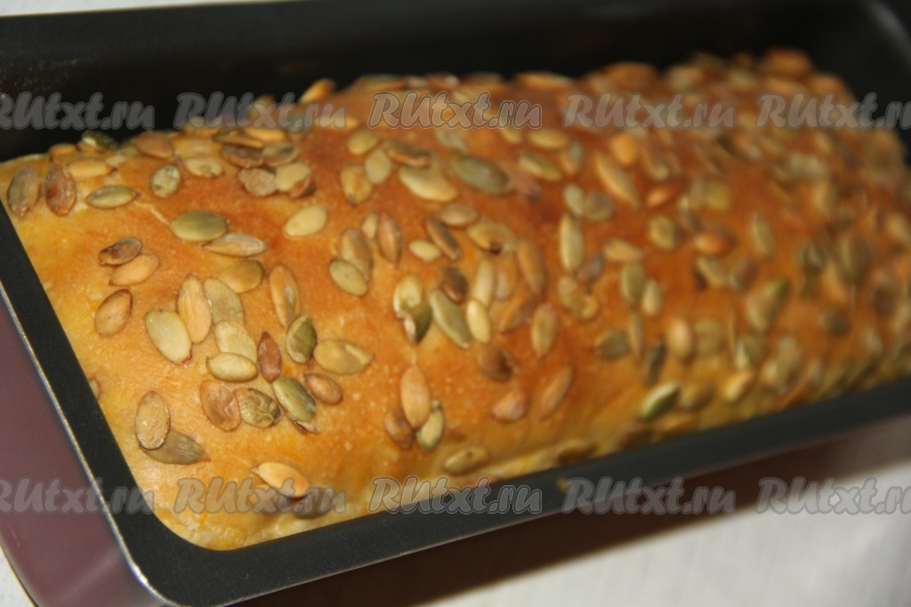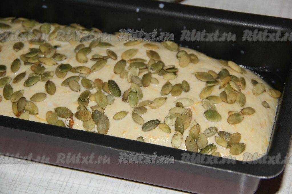 Затем посыпать хлеб семенами тыквы. Поставить форму в разогретую духовку и выпекать, примерно, 30-35 минут при температуре 200 градусов.