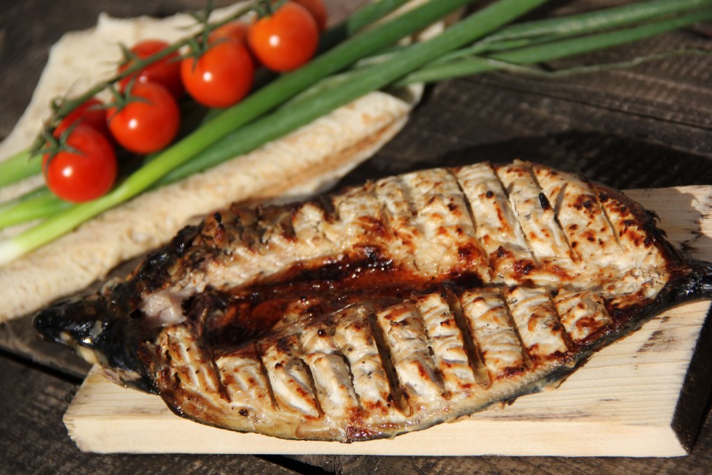 Хочу поделиться интересным рецептом приготовления скумбрии, запечённой на решётке на мангале. Рыба предварительно маринуется в смеси сметаны и соевого соуса. Скумбрия в таком маринаде, приготовленная на мангале, получается очень нежной, с ароматом дымка. Эта рыбка хороша как в горячем, так и в холодном виде. Её можно подать с любым гарниром или с овощами, приготовленными на гриле, лавашом, зеленью.
