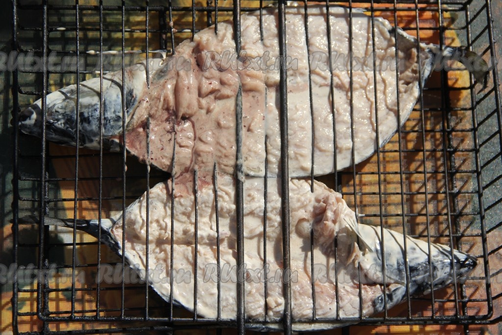 Подготовленную замаринованную скумбрию выложить на решётку в развёрнутом виде и хорошо прижать второй половинкой решётки. В мангале подготовить угли, они должны быть хорошо раскалёнными, но прямого огня быть не должно. Поместить решётку со скумбрией на подготовленный мангал. Запекать скумбрию минут 15, периодически переворачивая решётку.