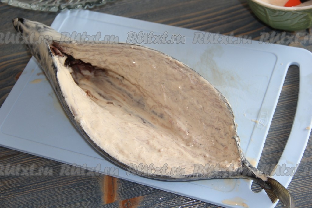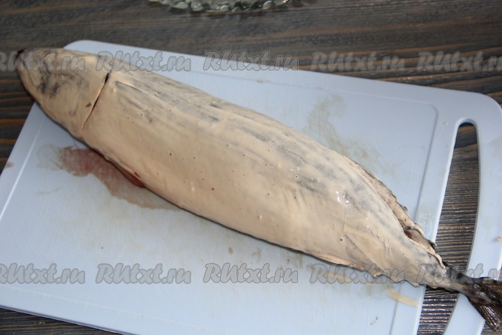 Затем хорошо смазать скумбрию внутри сметанно-соевым соусом. Сложить рыбу в удобный лоток и оставить на 1 час мариноваться при комнатной температуре.
