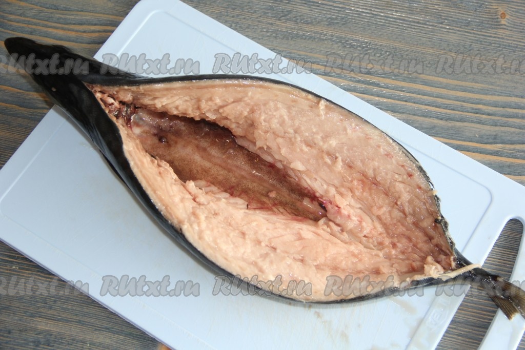 Разделать скумбрию, разрезав её вдоль хребта с двух сторон от плавника, как на фото. С помощью ножниц отрезать хребет возле головы и возле хвоста. Вынуть хребет из рыбы, оставляя целыми бока и брюхо. Удалить внутренности и чёрную плёночку. Убрать оставшиеся кости, вынуть жабры из головы. Сполоснуть рыбу под проточной водой.