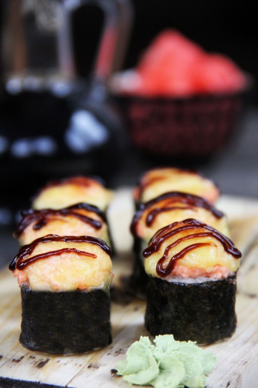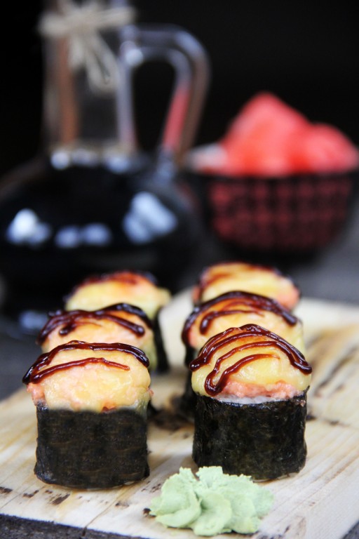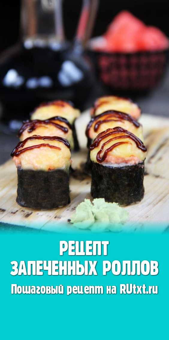Готовые роллы подать в горячем виде с соевым соусом, вассаби и маринованным имбирём. Смотрятся они очень эффектно и хорошо держат форму. Запеченные роллы - отличная домашняя закуска как для праздничного стола, так и для семейного ужина.