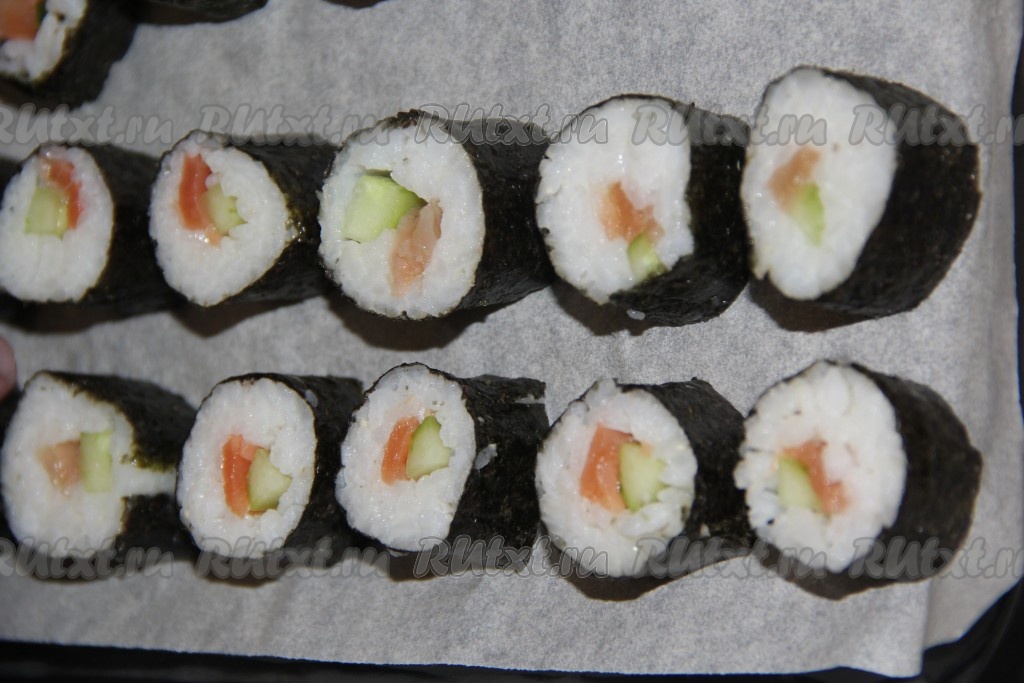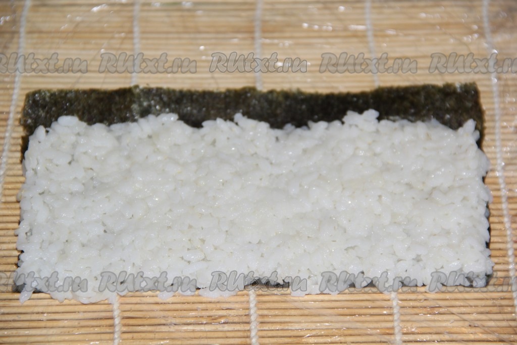 Лист нори разрезать на две части и выложить на циновку блестящей стороной вниз. Затем выложить слой риса, оставив свободный край листа нори (примерно, один сантиметр).