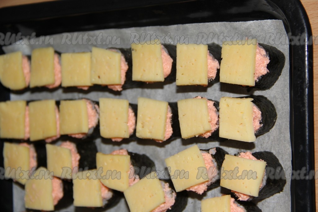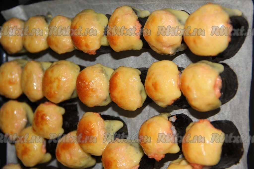 Запекать роллы в разогретой духовке при температуре 200 градусов при верхнем нагреве, примерно, 10 минут. Нам нужно, чтобы сыр расплавился и покрылся золотистой корочкой.