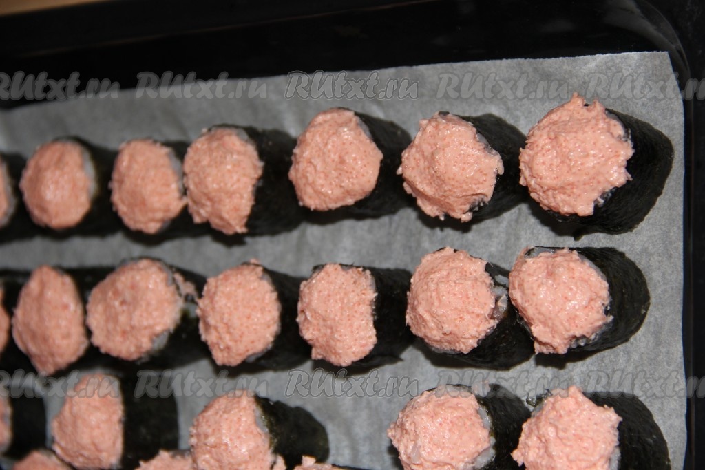 Нарезать рулет на 8 кусочков (использовать хорошо заточенный нож, чтобы не деформировать роллы). Противень для запекания застелить пергаментом. Выложить роллы на противень. Из указанного количества ингредиентов в итоге получается 40 роллов.