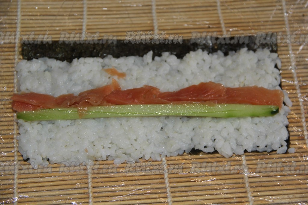 Огурец вымыть и нарезать длинными брусочками. Рыбку нарезать длинными полосками. Выложить на рис брусочки огурца и рыбу.