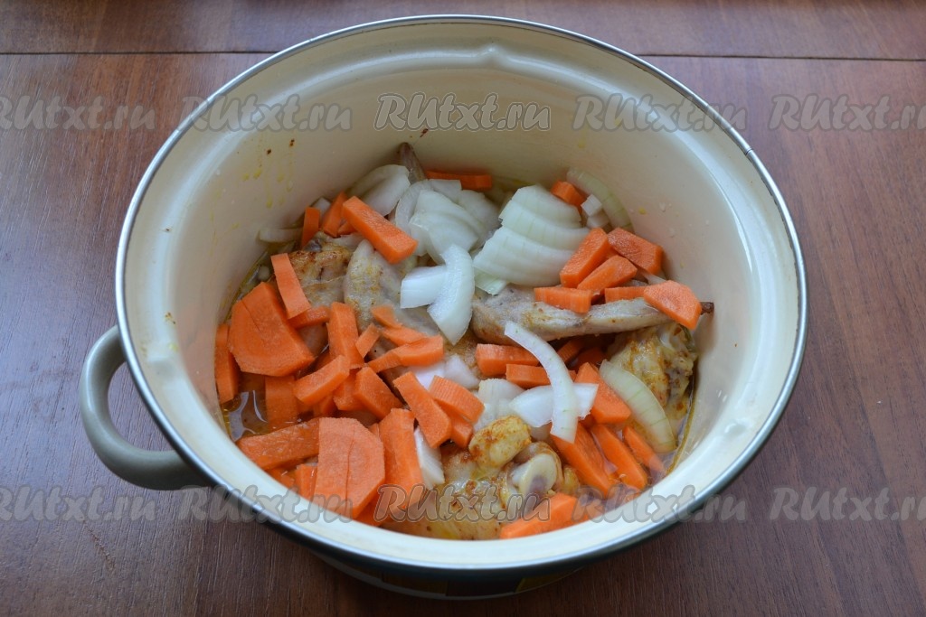 Добавить в кастрюлю нарезанные репчатый лук и морковь, влить горячий подсоленный бульон или подсоленную воду. Тушить куриные крылышки на медленном огне 20-25 минут.