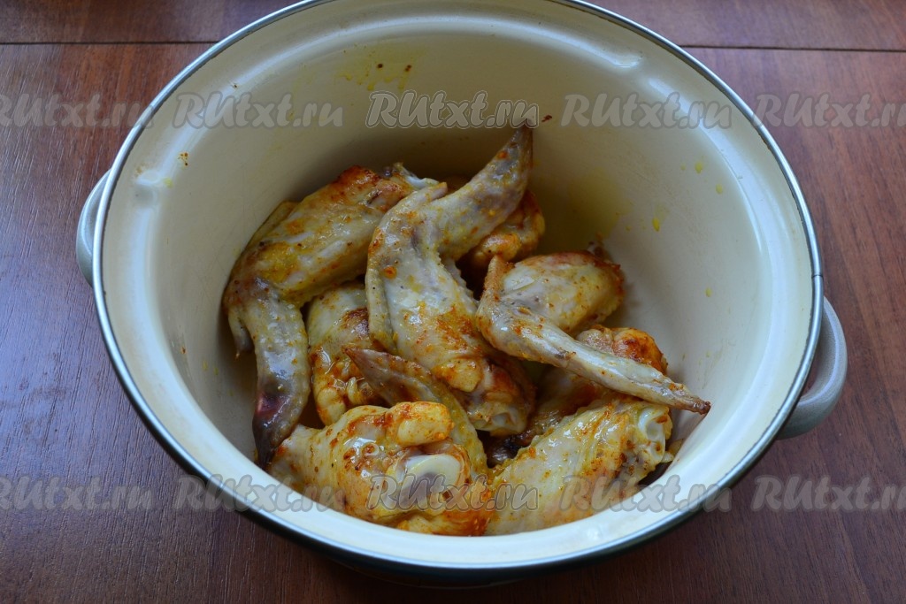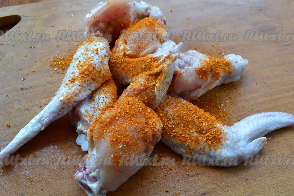 Куриные крылья разрезать на 2 части, кончики можно удалить, можно оставить. Посолить крылья, посыпать специями для курицы.