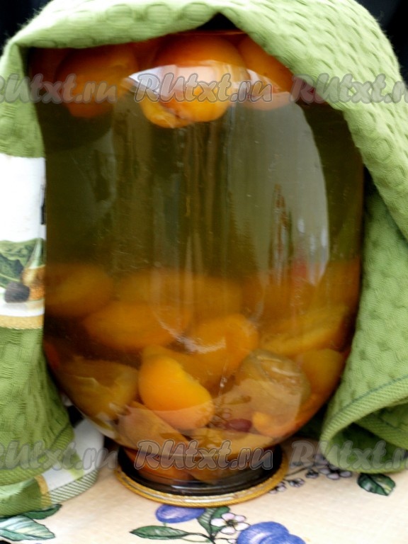 Перевернуть банку на крышку и укутать чем-то тёплым для дальнейшей стерилизации. Оставить банки с компотом из слив и абрикосов на сутки.