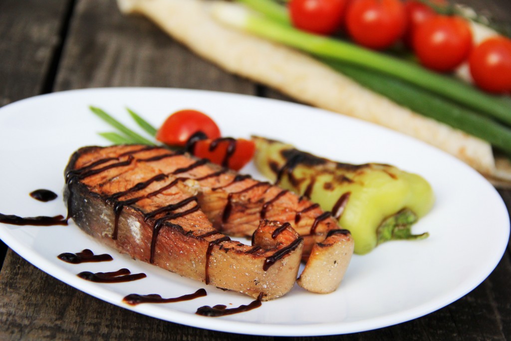 Запечь стейки с двух сторон (каждую сторону по 3-5 минут, в зависимости от жара). Я переворачивала кусочки рыбки щипцами.