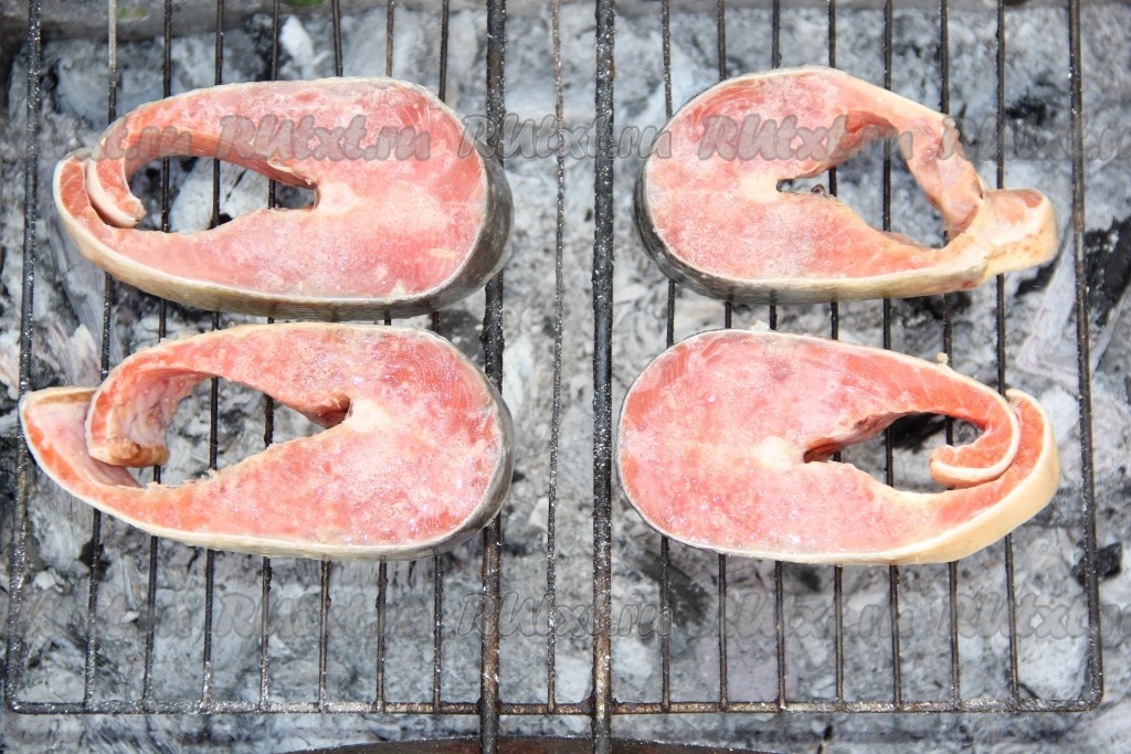 Выложить стейки кеты на решётку мангала над горячими углями.