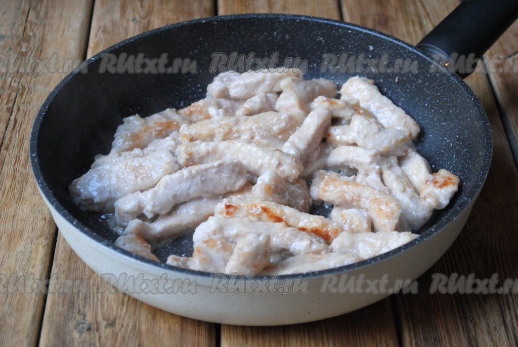 Обжарить мясо на сильном огне, без крышки, помешивая, до румяной корочки со всех сторон (на это уйдёт 2-3 минуты).