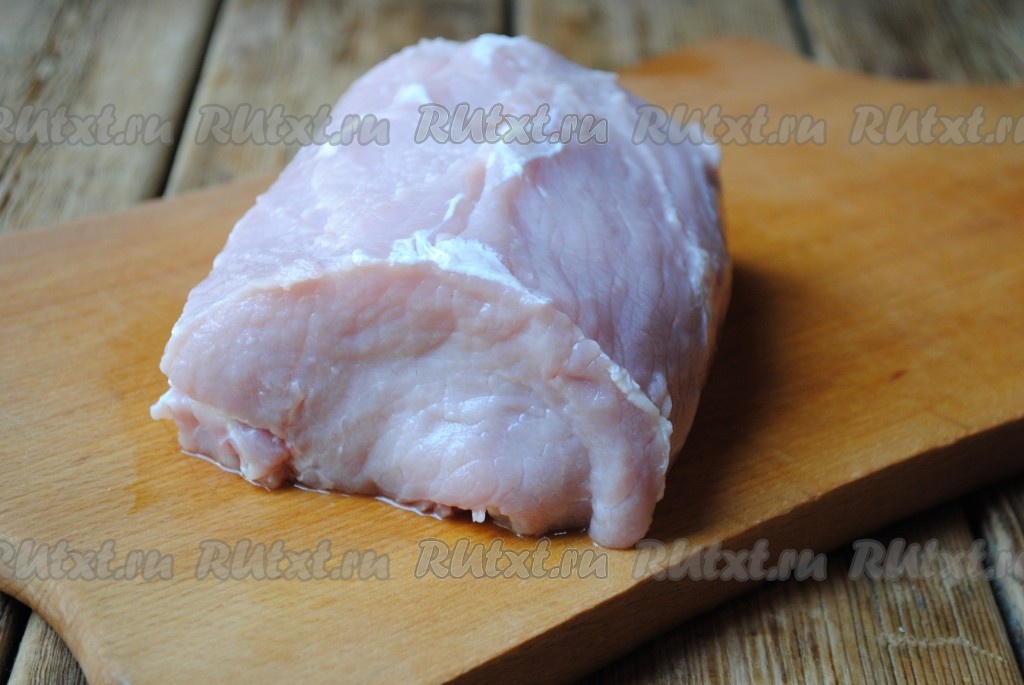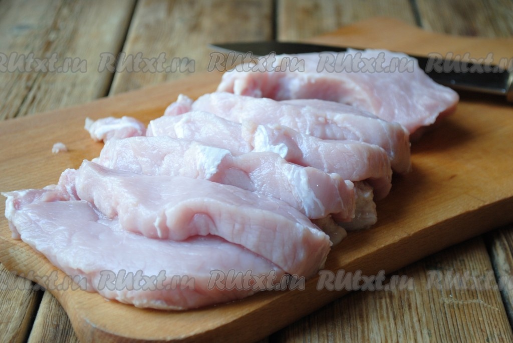 Нарезать свинину кусочками толщиной 2-2,5 см.