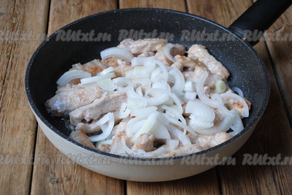 Очищенный лук нарезать полукольцами, добавить к обжаренному мясу, жарить, помешивая, на среднем огне минут 5.