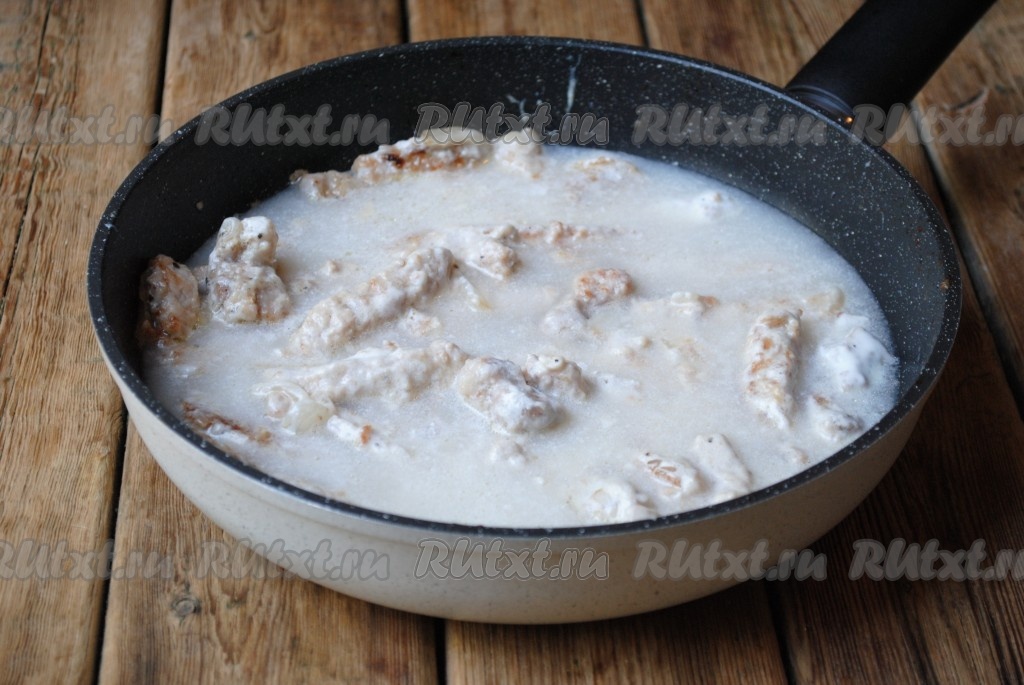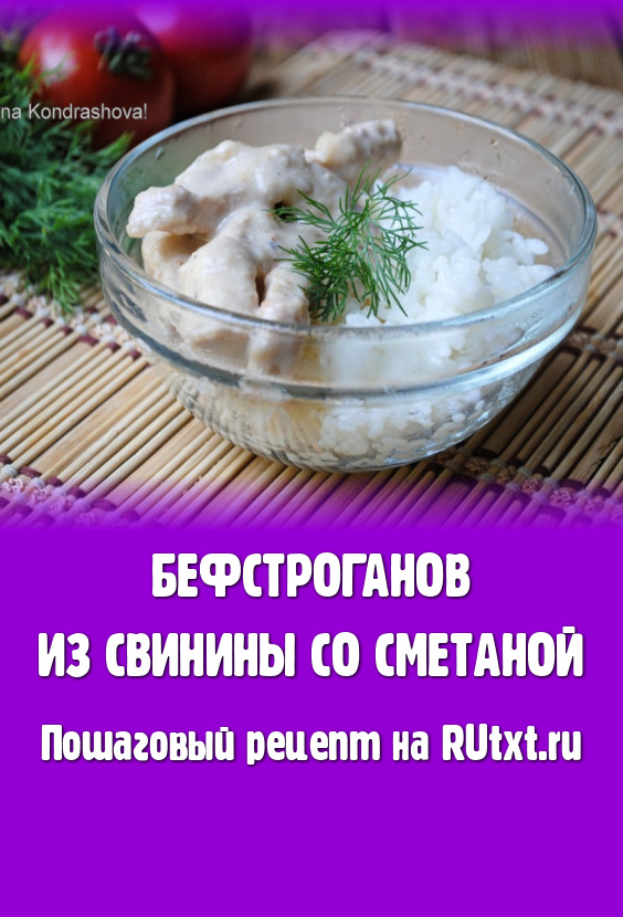 Уменьшить огонь до минимального и готовить бефстроганов из свинины со сметаной под крышкой 15-25 минут (до полной готовности мяса). Если соус стал густым, а мясо ещё жесткое - нужно добавить ещё немного воды и продолжить тушение.
