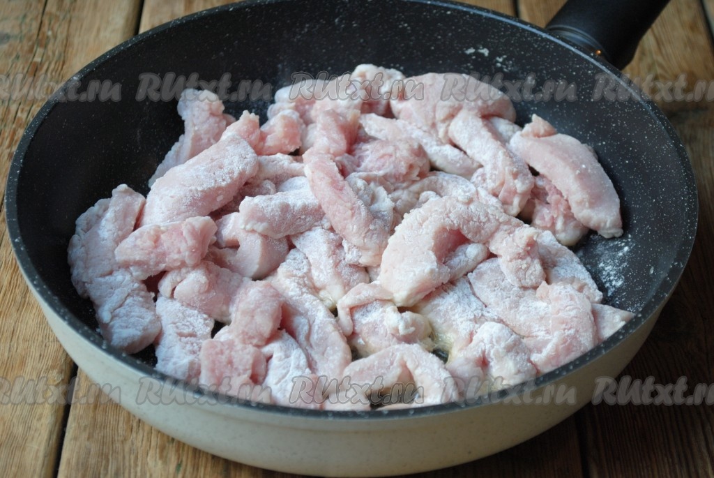 В сковороде разогреть смесь растительного и сливочного масел. Кусочки свинины обвалять в муке и отправить на сковороду.