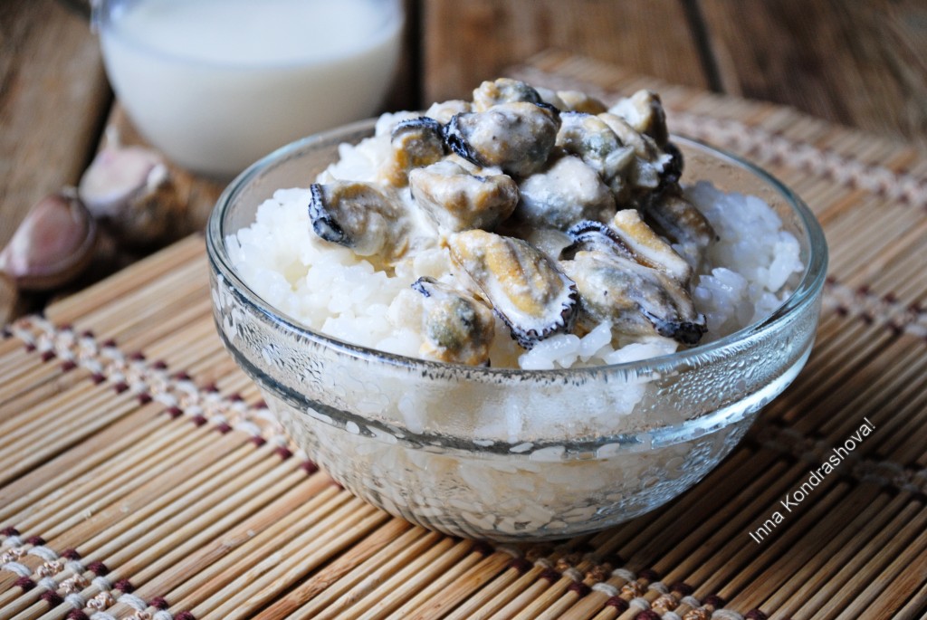 Подавать их в тёплом виде с отварным рисом. Сливочно-чесночный соус в этом рецепте подчеркивает нежный вкус мидий и дает потрясающий аромат.