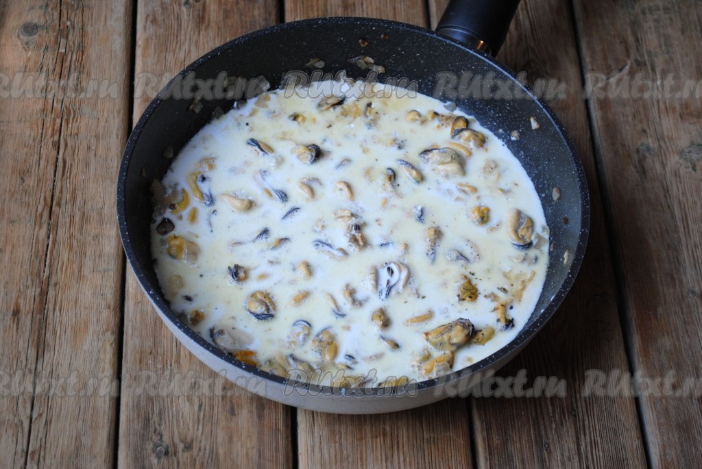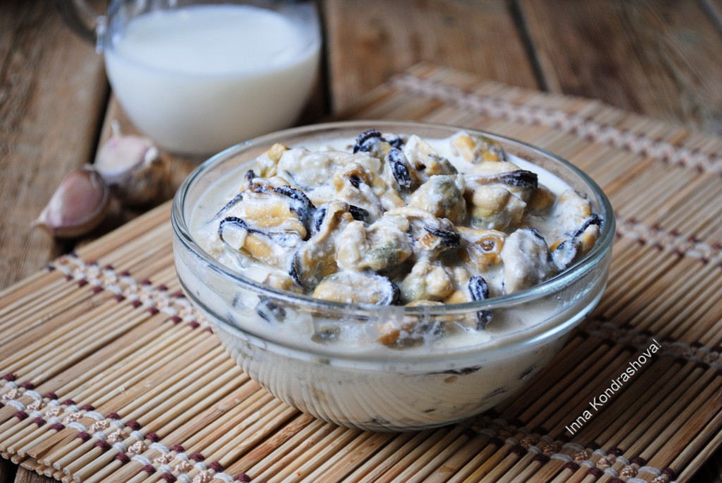 Очень вкусные мидии в сливочно-чесночном соусе готовы.