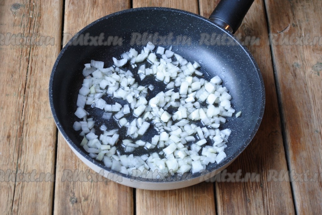 Очищенный лук нарезать небольшими кубиками и обжарить на растительном масле на среднем огне, помешивая, в течение 5 минут.