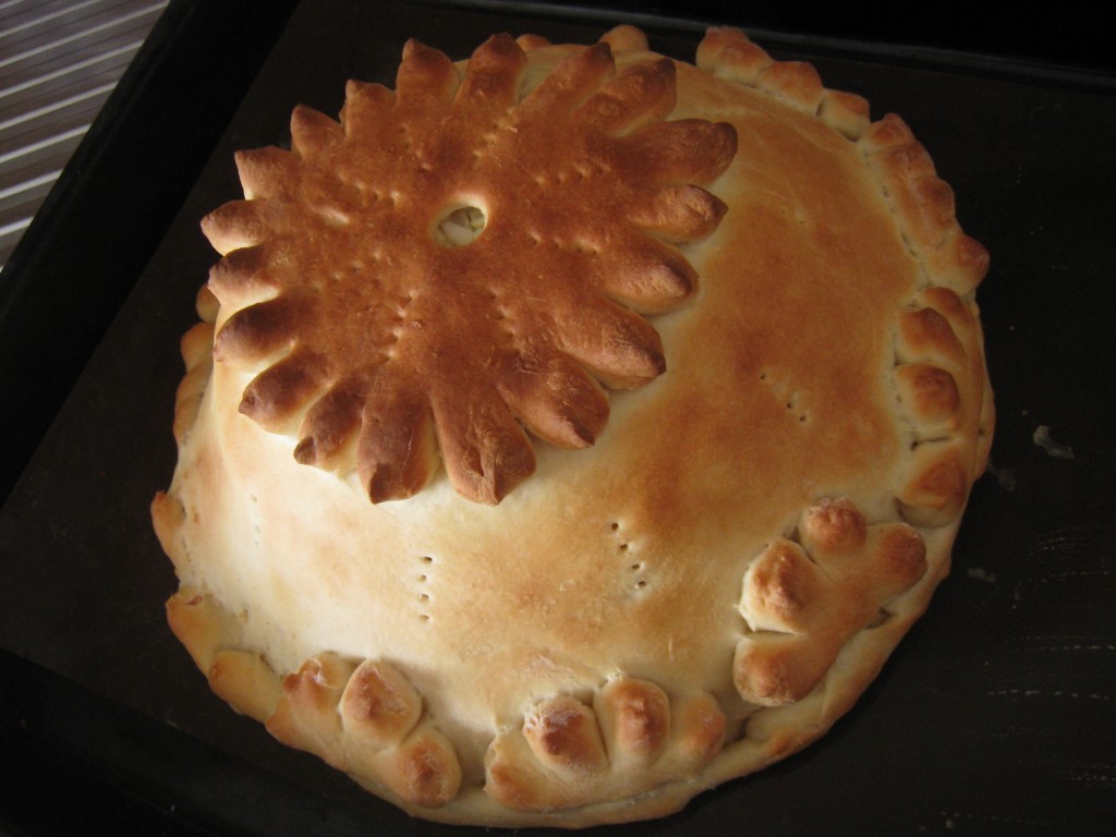 Если отверстие в тесте (как у меня) получилось великовато, то накрыть его кусочком теста с отверстием поменьше. Тесто в нескольких местах наколоть вилкой. Тесто смазать молоком (или желтком).