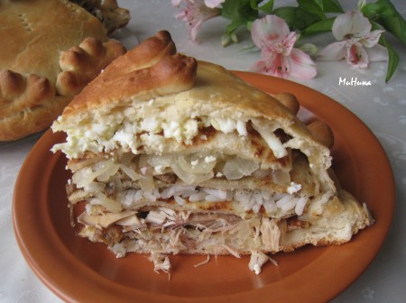 Курник - праздничное блюдо русской кухни. Его называют королём пирогов. Из исторической литературы известно, что его подавали к царскому столу в торжественных случаях. В некоторых областях России курник считается обрядовым свадебным пирогом. Курники изначально готовили с пшеном, потом стали выпекать с гречкой, а сейчас всё чаще с рисом. Я познакомлю с рецептом курника из дрожжевого теста и блинов с начинкой из куриного мяса, риса, грибов, лука и яиц (начинку можно подобрать в соответствии с своими предпочтениями). Выпечка получается сытной и потрясающе вкусной.