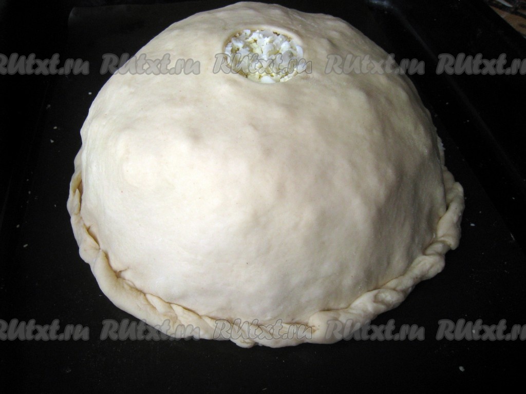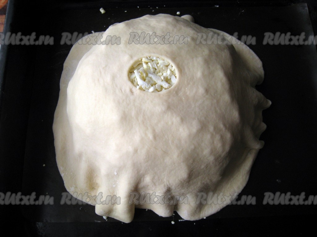 Затем оставшееся дрожжевое тесто (небольшой кусочек теста оставьте для украшения курника) раскатать в большой тонкий круг. В центре круга сделать небольшое отверстие и накрыть этим тестом пирамиду из начинок и блинов, соединить края этого теста с краями нижнего круга теста. По возможности красиво подвернуть.