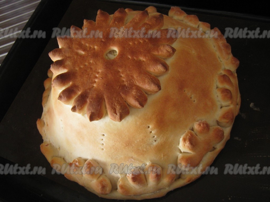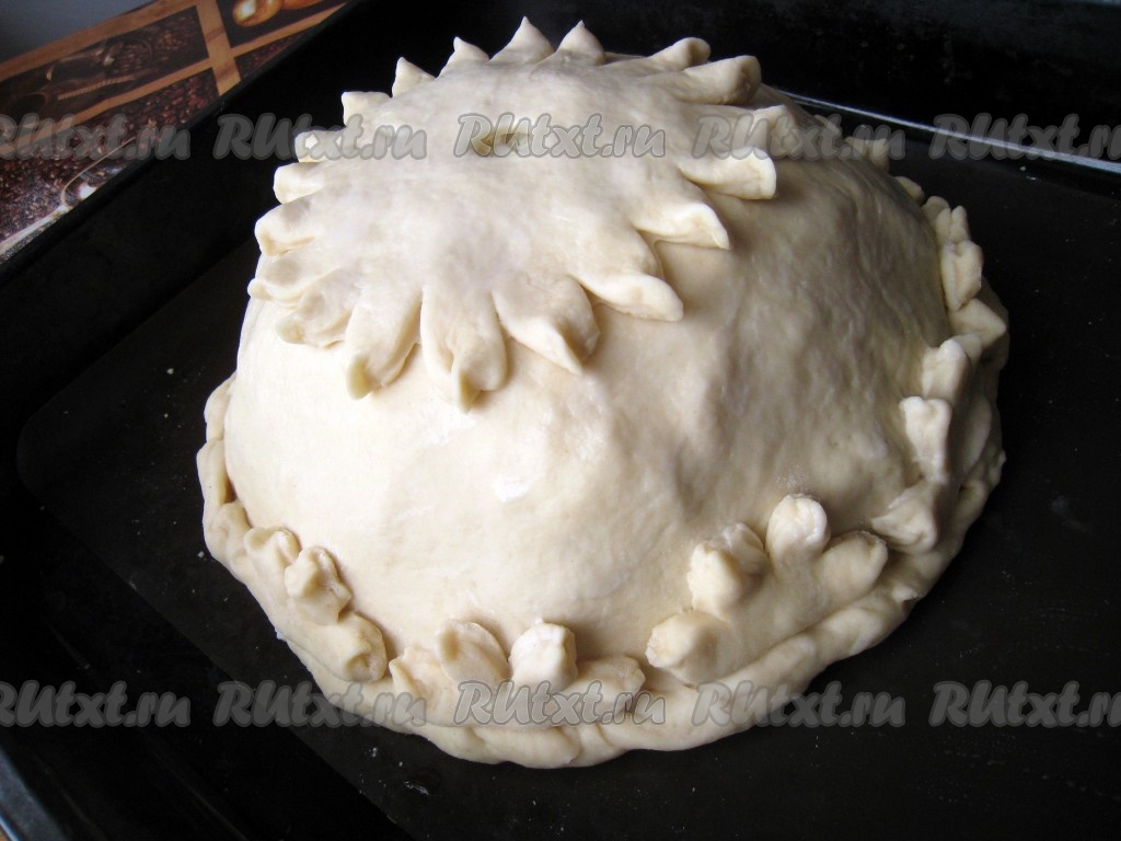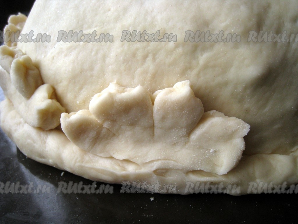 Сделать из оставшегося небольшого кусочка дрожжевого теста какие-нибудь цветочки, лепесточки или что-то на свой вкус и украсить курник.