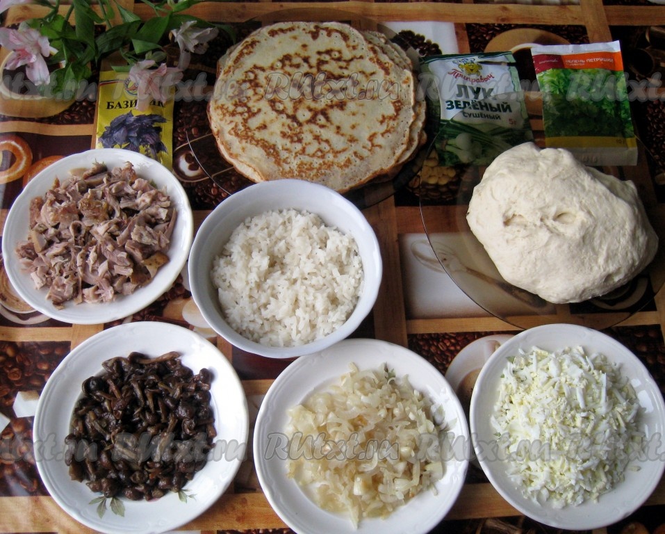 Куриные бёдра посолить, добавить специи по вкусу и запечь до готовности в духовке, потом нарезать на кусочки. Замороженные опята разморозить и пожарить. Яйца сварить вкрутую, очистить и натереть на крупной тёрке. Рис сварить до готовности. Репчатый лук нарезать и обжарить на растительном масле. Испечь блины (например, по этому рецепту). Дрожжевое тесто можно купить в магазине или замесить по Вашему любимому рецепту (например, замесить в хлебопечке).