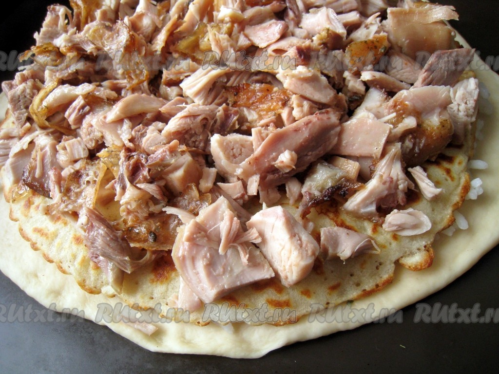 Накрыть рис блином и положить на него кусочки курицы.