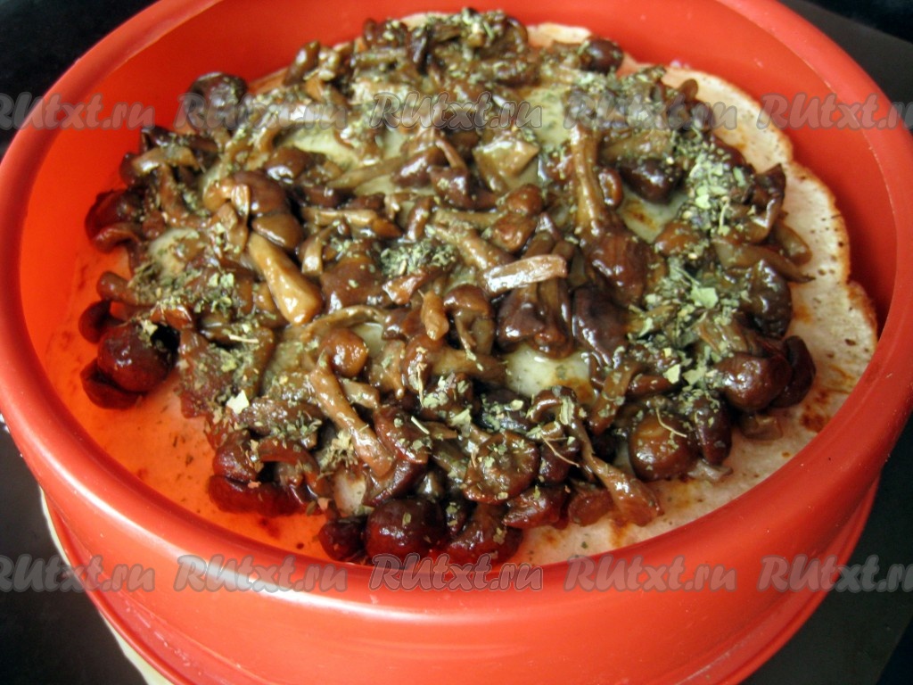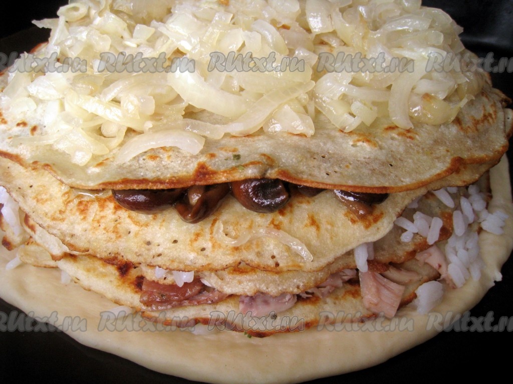 Накрыть блином грибную начинку и выложить жареный лук.