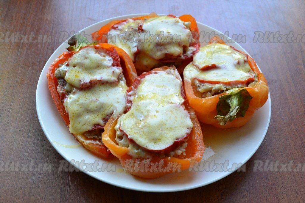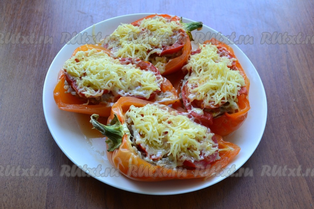 Поместить фаршированный перец в микроволновку. Готовить при мощности 750 Ватт 7 минут. Затем щедро посыпать перец натертым на мелкой терке твердым сыром.