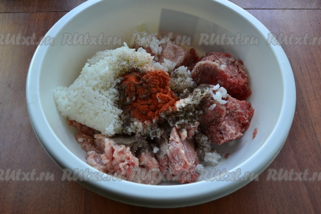 К фаршу добавить отварной рис, соль, перец, специи и паприку. Хорошенько его вымешать.