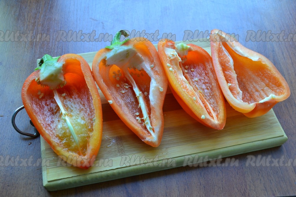 Перец разрезать на 2 части, удалить семена, оставив хвостики.