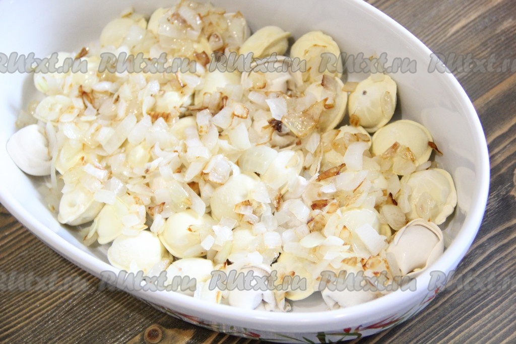 Хочу предложить для ужина лёгкий в приготовлении рецепт пельменной запеканки. Запеканочка готовится в духовке из замороженных пельменей с добавлением обжаренного лука и твердого сыра, получается очень вкусной и сытной. Это хорошая альтернатива отварным пельменям.