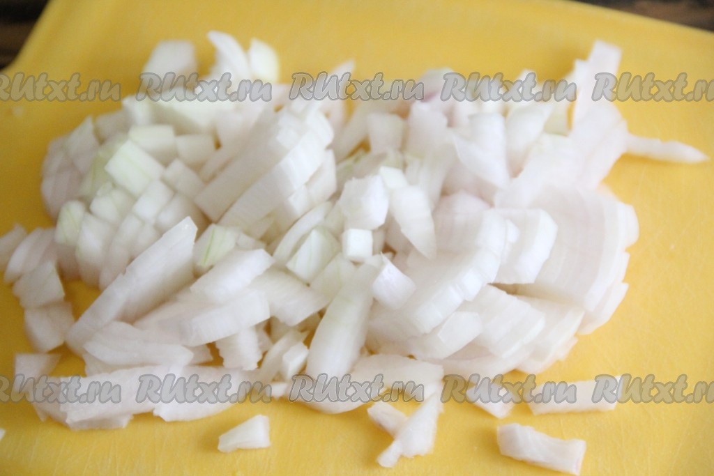 Лук выложить на сковороду с растительным маслом и обжарить, помешивая, до золотистого цвета.