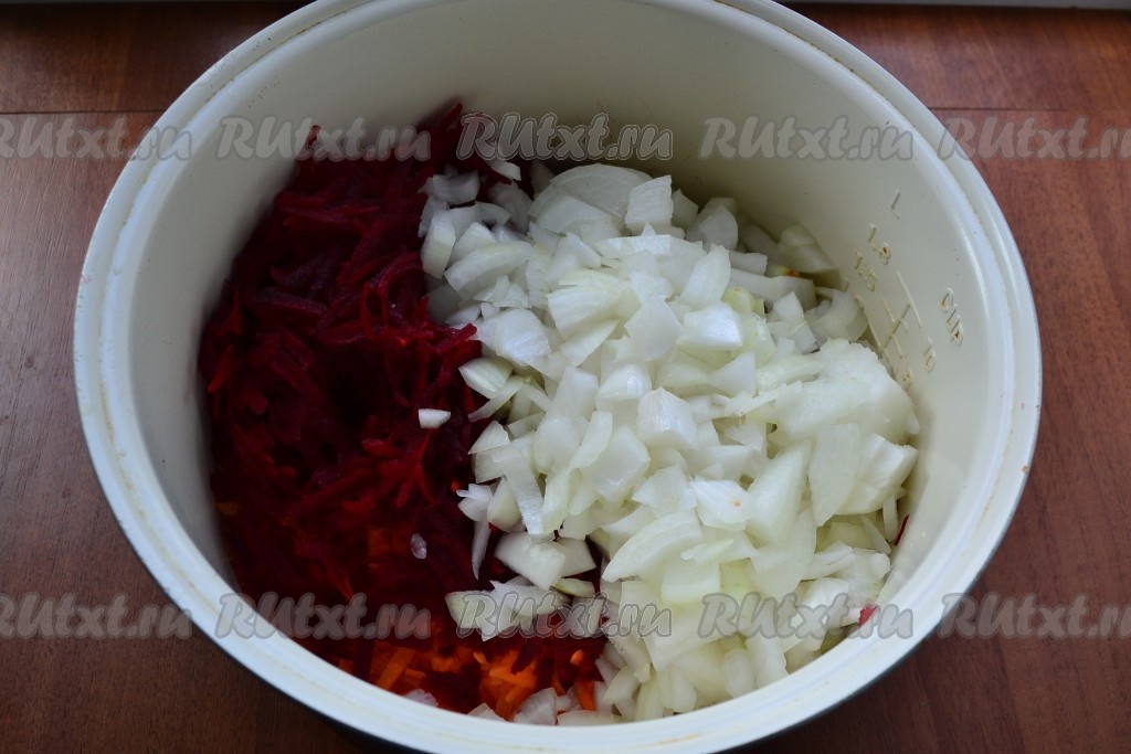 Лук, свеклу и морковку очистить. В чашу мультиварки или кастрюлю поместить натертую на крупной терке морковь.