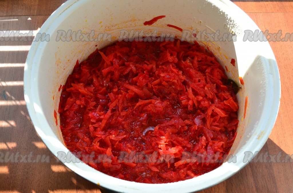 Банки с очень вкусной, ароматной, с насыщенным цветом свекольной заправкой для борща, приготовленной на зиму, перевернуть, укутать до полного остывания. Хранится эта заготовка при комнатной температуре.