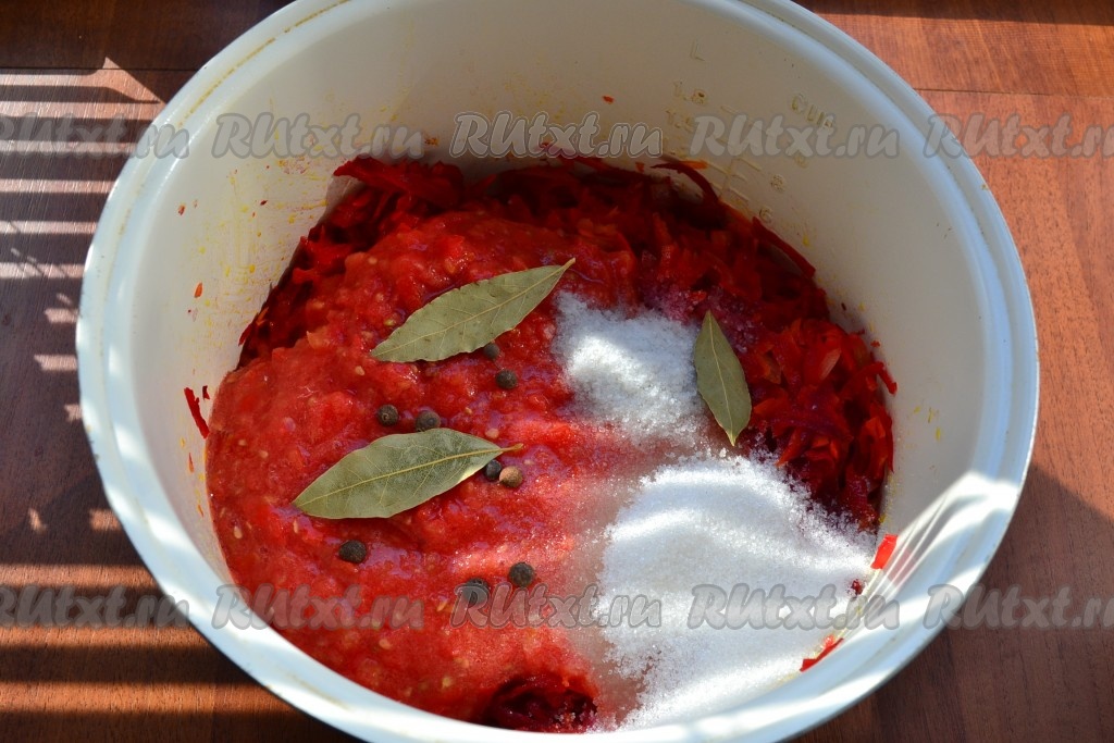 Влить в чашу растительное масло, воду и третью часть уксуса. Аккуратно все перемешать, выставить программу мультиварки "Тушение" на 20 минут, крышку закрыть. Если готовить в кастрюле, также, тушить овощи 20 минут при небольшом огне, прикрыв крышкой, обязательно помешивая. Затем добавить к овощам перекрученные на мясорубке помидоры, соль, сахар, оставшийся уксус, душистый перец и лавровые листья, перемешать.
