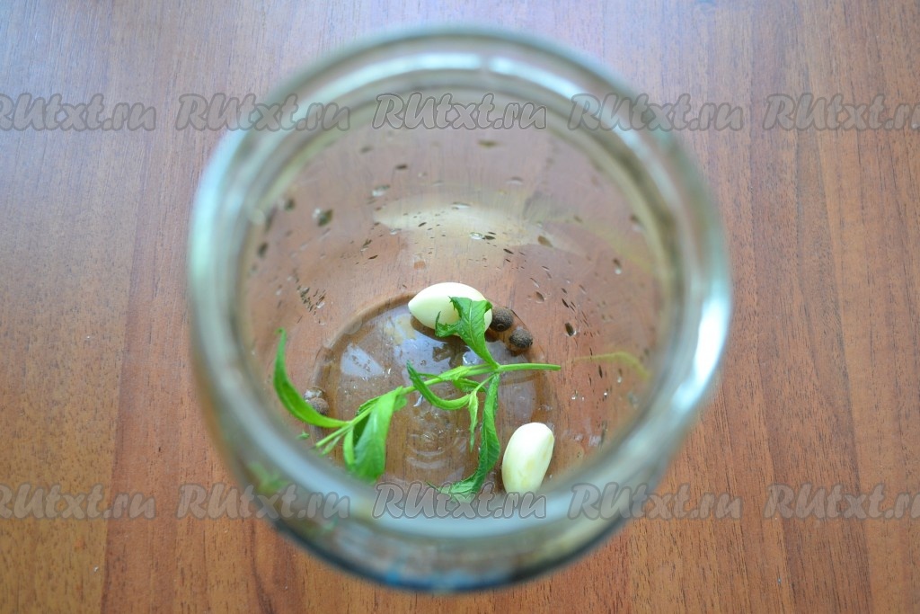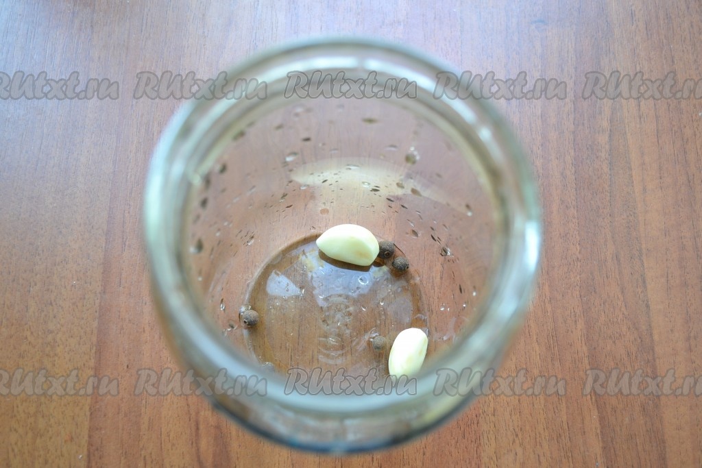 На дно чистой банки поместить зубчики чеснока и душистый перец.