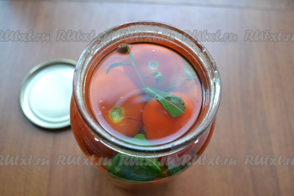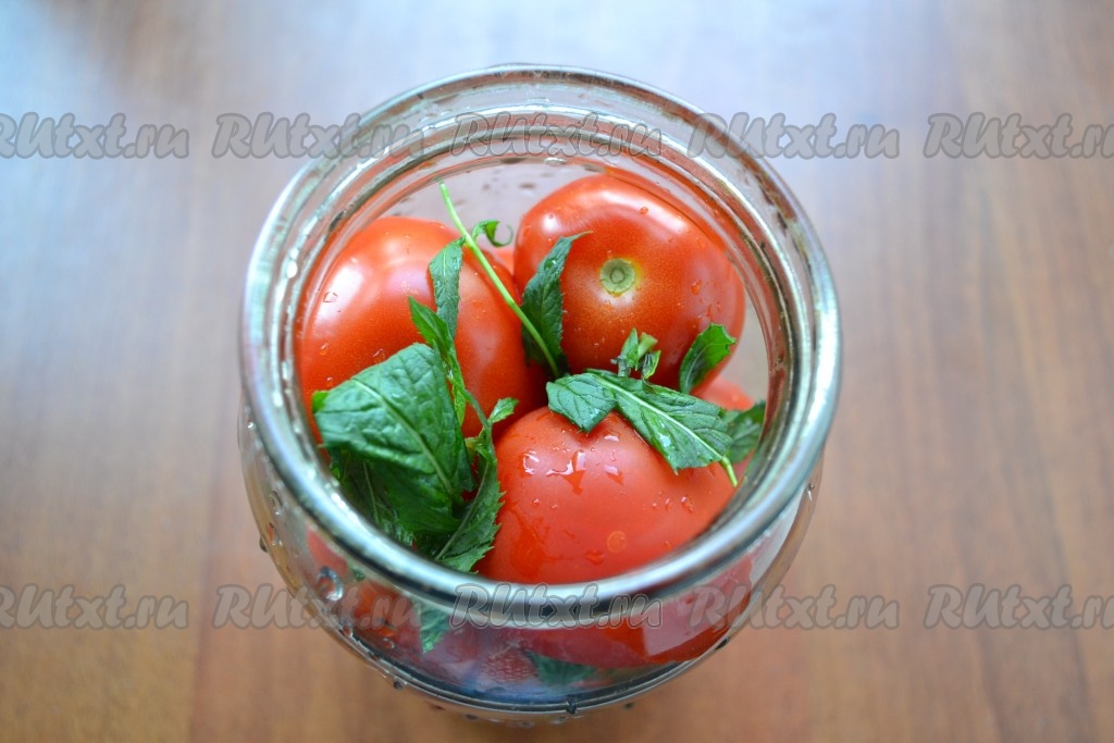 Наполнить плотно банку вымытыми помидорами, чередуя их с оставшейся мятой.