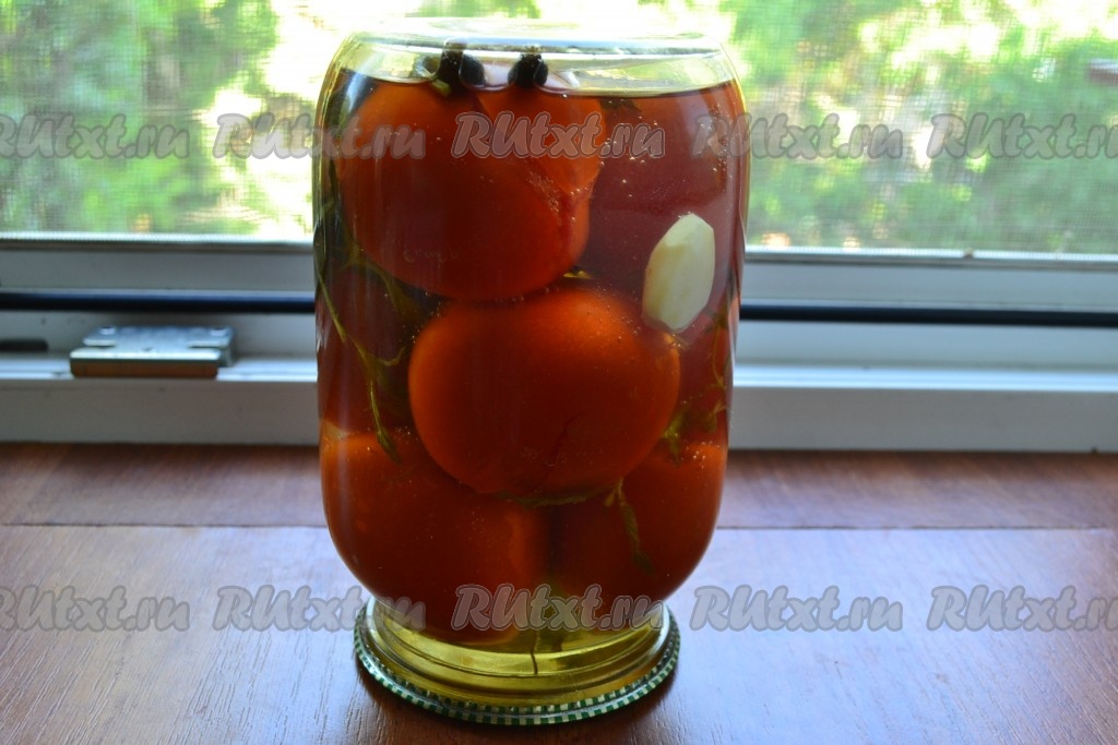 Сразу же банку с помидорами закатать прокипяченной крышкой, перевернуть.