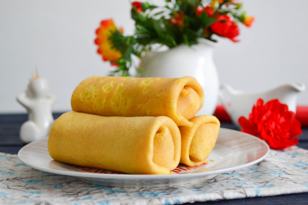Как дополнение к таким яичным блинам с начинкой подойдет сметана или овощные соусы.